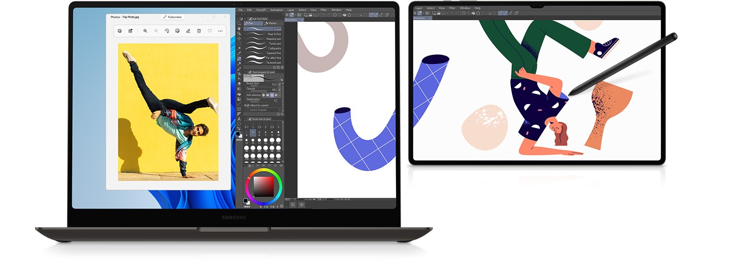 Зголеми ја продуктивноста со Galaxy Tab како втор екран. Апликацијата Second Screen PC ти овозможува да го прошириш екранот на PC на Galaxy Tab, со што добиваш повеќе работен простор преку безжично или жично поврзување. Ти текна одлична идеја? Запиши ја и илустрирај ја со помош на S Pen пенкалото – запиши ги идеите и спроведи ги. 9