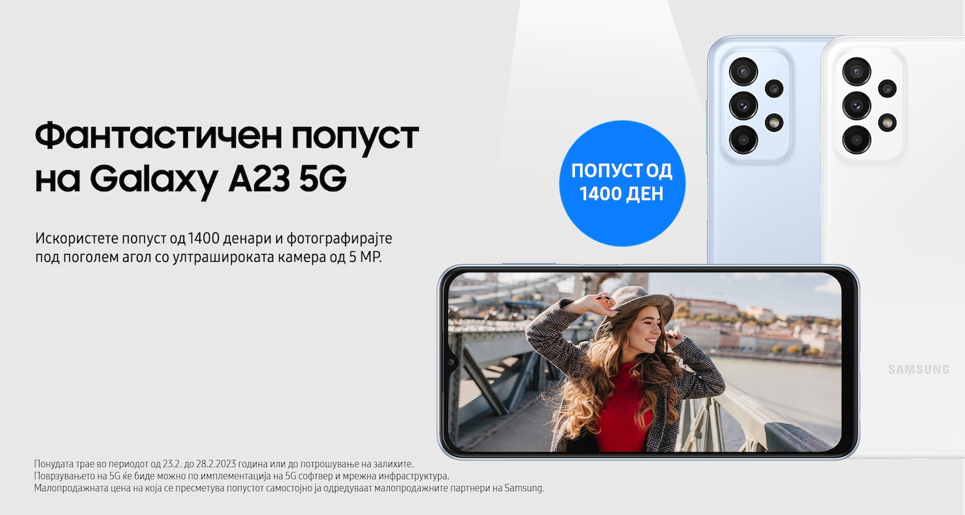 Фатете фантастичен попуст од 1400 денари на Galaxy A23 5G во периодот од 23 до 28 февруари 2023 година. Искористете ја можноста и зачекорете во свет во кој можете да гледате и да правите повеќе од кога било досега, со големиот Infinity-V екран од 6,6 инчи на телефонот Galaxy A23 5G и неговата моќна технологија FHD+, која овозможува брзина на освежување на екранот од 120 Hz. Отсега, покрај работата и гледањето на омилените содржини, пред вас стои и можноста да ги развивате вашите таленти, благодарение на камерата со повеќе објективи и главната камера од 50 MP на овој фантастичен уред.
