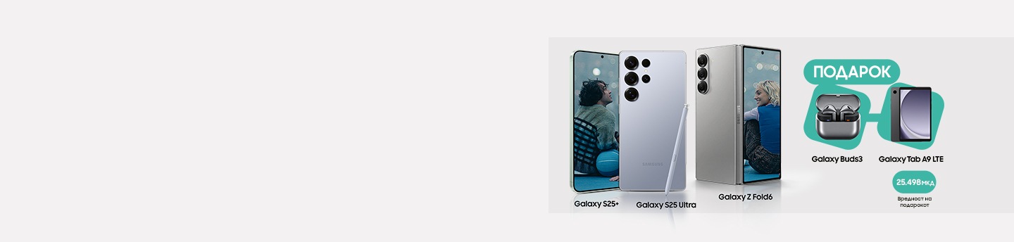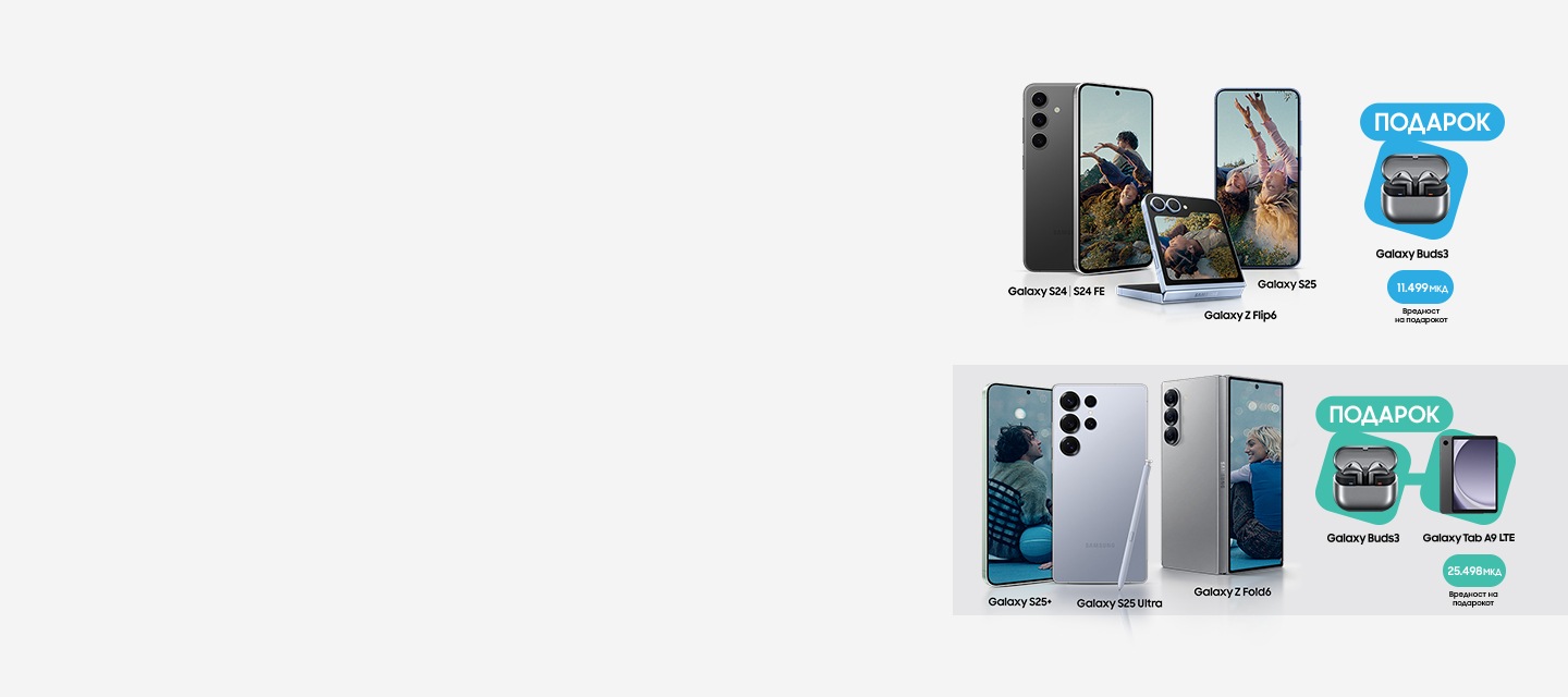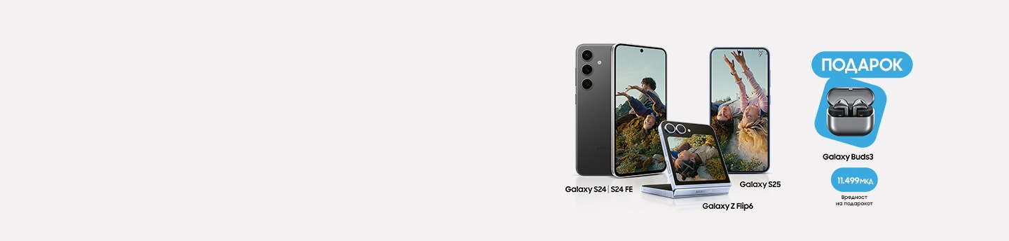 Избери Galaxy S24, S24 FE, S25 или Z Flip6 и добиваш подарок слушалки Galaxy Buds3. Ако се одлучиш за Galaxy S25+, S25 Ultra или Z Fold6, како подарок добиваш и Galaxy Buds3 и Galaxy Tab A9 LTE 4/64. Не заборавај дека ексклузивно и само со Galaxy S25 Ultra, доаѓа и S Pen пенкало..