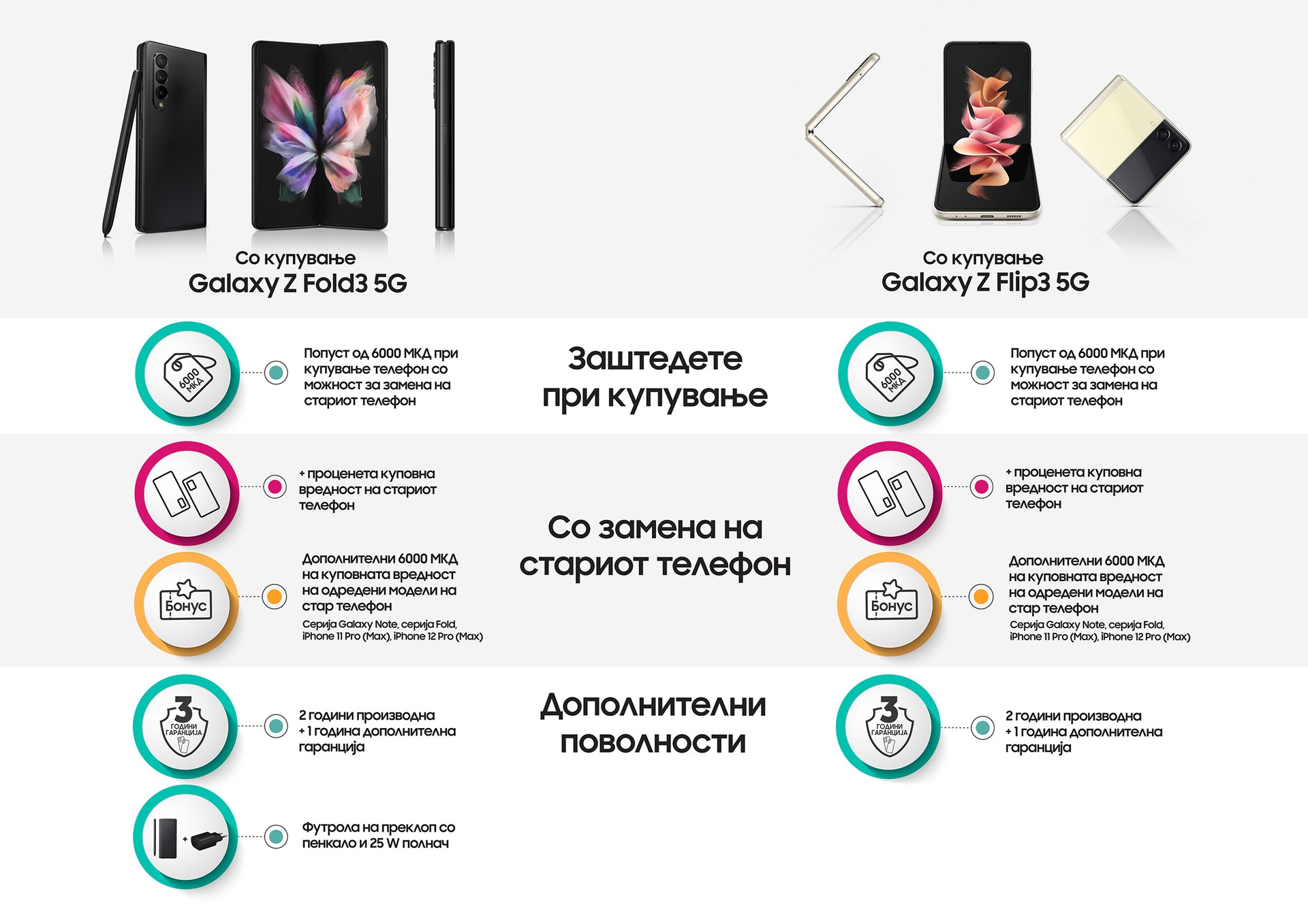 За време на промотивниот период од 11 август до 26 август 2021 година, заменете го вашиот користен мобилен телефон и искористете го пакетот со придобивки почнувајќи од 6000 денари за новиот Samsung Galaxy Z Fold3 или Samsung Galaxy Z Flip3 *