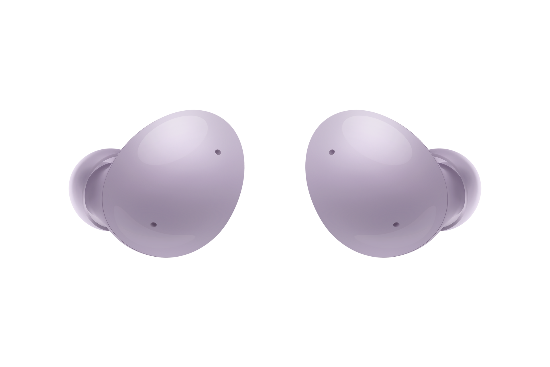 A white Buds2 case is placed in front of a desert with shades of lavender in the sky. Two lavender Buds2 earbuds are shown with the Galaxy Buds2 case. A Buds2 case is open with two earbuds inside. There are two earbuds displayed outside of its case.