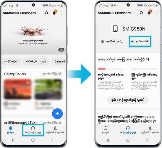 အဆင့် ၁။ Samsung Members အက်ပ်ကိုဖွင့်ကာ စခရင်၏အောက်ဖက်ရှိ အကူအညီရယူရန်ကိုနှိပ်ပါ။