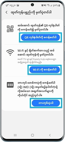 အဆင့် ၃။ မှတ်ပုံတင်မည့် နည်းလမ်းကို ရွေးချယ်ပါ - QR ကုဒ်နံပါတ်ကို စကန်ဖတ်ပါ၊ Wi-Fi ကို စကန်ဖတ်ပါ သို့မဟုတ် ဘားကုဒ်သုံးပါ။