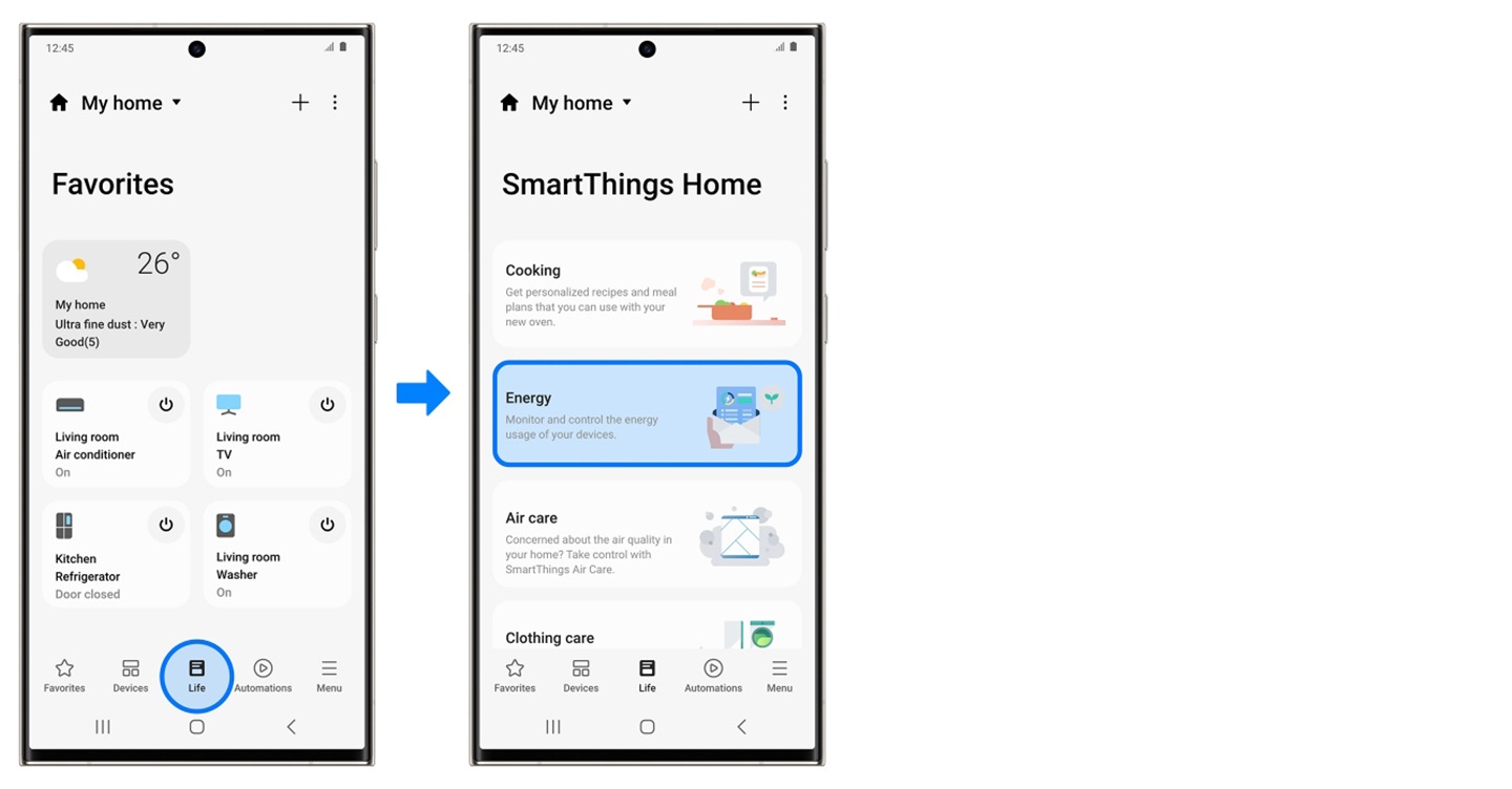 SmartThings апп дээр хамгийн доод талд байх 'Life' коммандыг дарж, 'Energy1'-ийг татна.