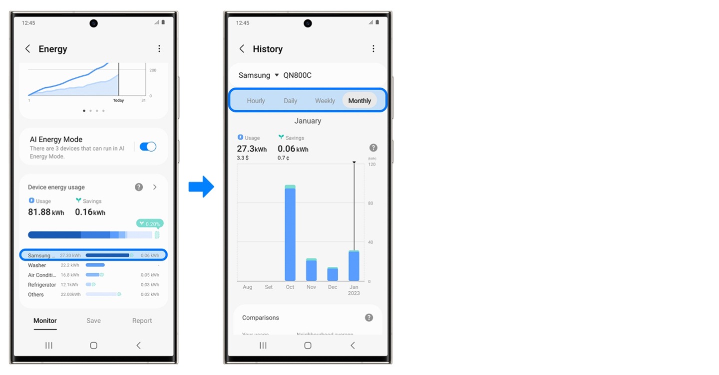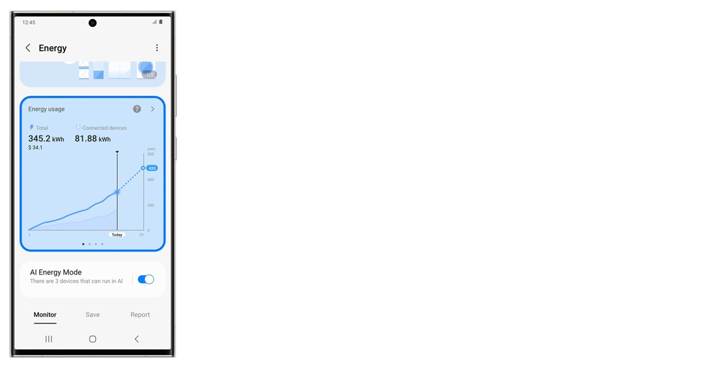 - AI Energy Mode функц нь улс, бүс эсвэл төхөөрөмжөөс хамаарч хязгаарлагдмал байж болно. Уг функц нь нийцэж ажиллах бүхий ухаалаг цахилгаан хэрэгслийн ажиллах горимыг таны цахилгааны төлбөр урьдчилан тохируулсан босгыг давсан бол эсвэл автоматаар өөрчилнө. (Хөргөгчөөр жишээ авахад, компрессорын хурд, ажиллагаа болон хөргөх температур зэргийг өөрчилнө) SmartThings Energy дээр харуулах эрчим хүчний хэрэглээ болон урьдчилан тооцоолсон зардал нь бодит хэрэглээ болон зардлаас өөр байж болно.