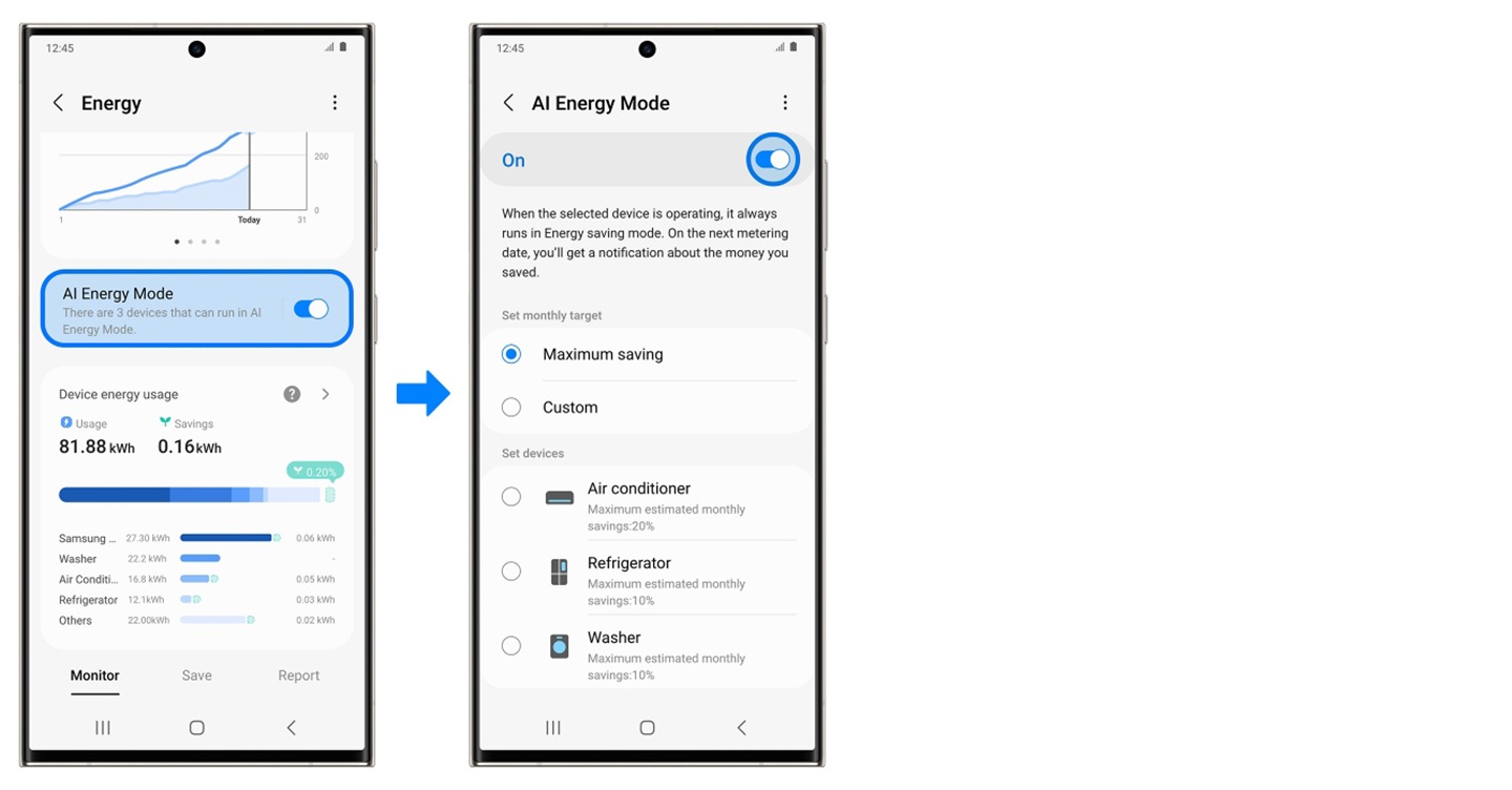 Та цахилгааны төлбөртөө санаа зовж байна уу? SmartThings Energy1 функцыг ашиглан, та гэрийнхээ цахилгаан хэрэгслүүдийн эрчим хүчний зарцуулалтыг нүд ирмэх зуур шалгахын зэрэгцээ Smart Plugs функцээр ухаалаг биш утасныхаа хэрэглээг ч мөн хянах боломжтой. Илүү их хэмнэлт гаргахын тулд AI Energy Mode3 функцыг идэвхжүүлж, урьдчилан тохируулсан хязгаар дотор эрчим хүчний хэрэглээг зохицуулах боломжтой.
