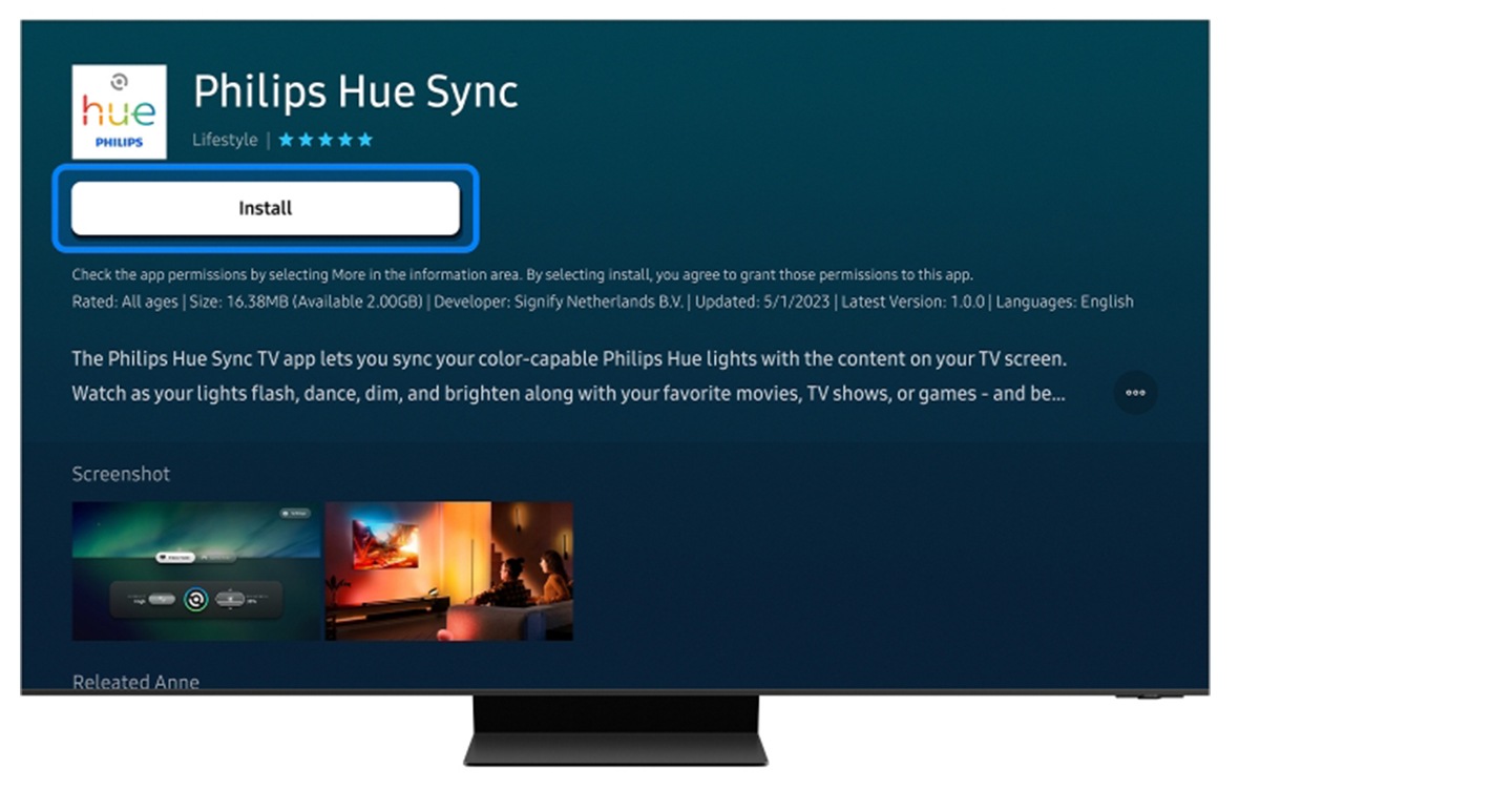 ТВ дээрээ та 'Apps' цэс рүү нэвтэрч, 'Philips Hue Sync' апп8-ыг хайна. 'Install' товч дээр дарж, апп-ыг татна.