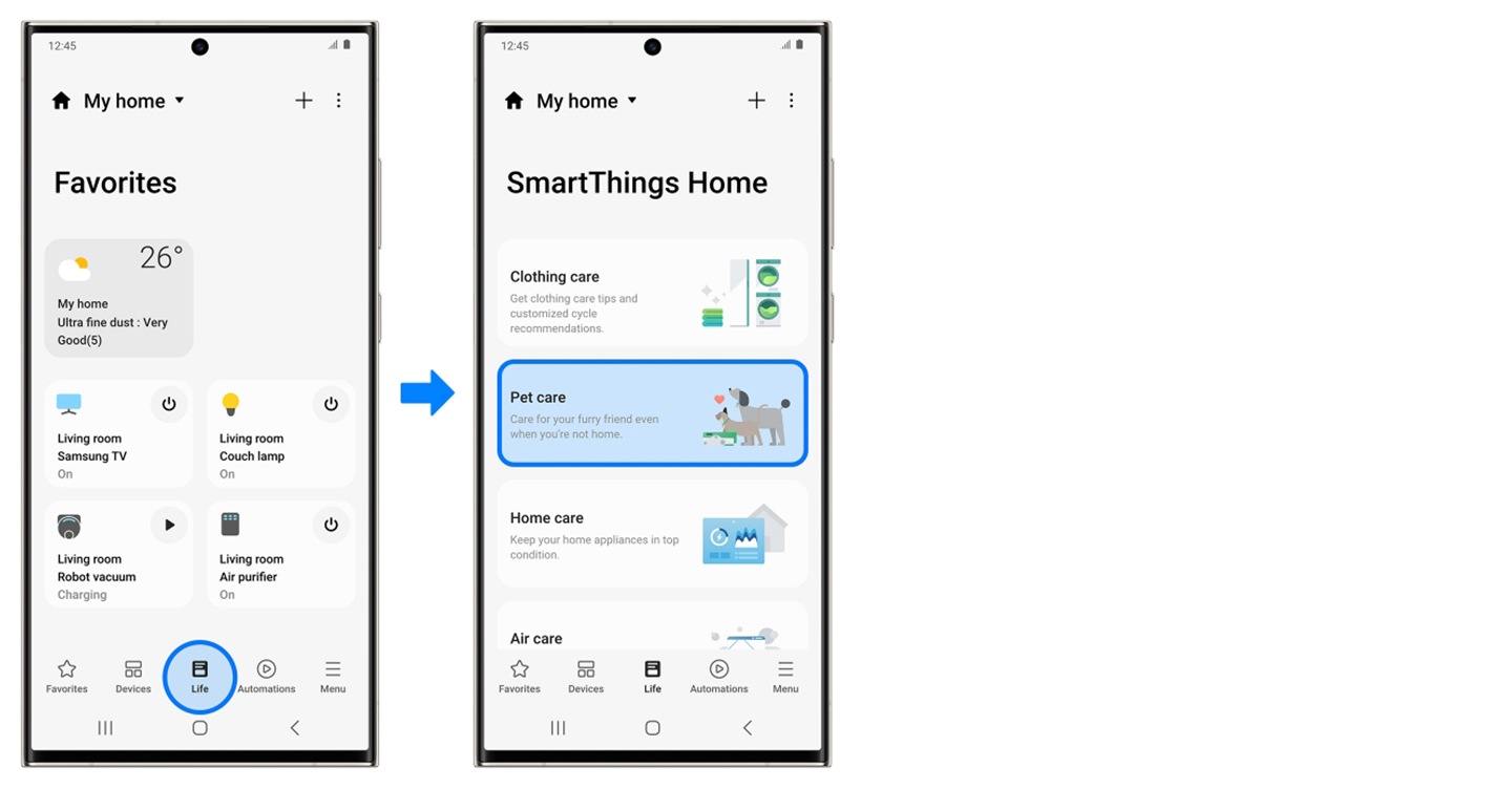 SmartThings апп руу нэвтэрч, доод хэсэгт байх 'Life' цэс дээр дарж, 'Pet care' аппликэйшнийг татаж аваарай.