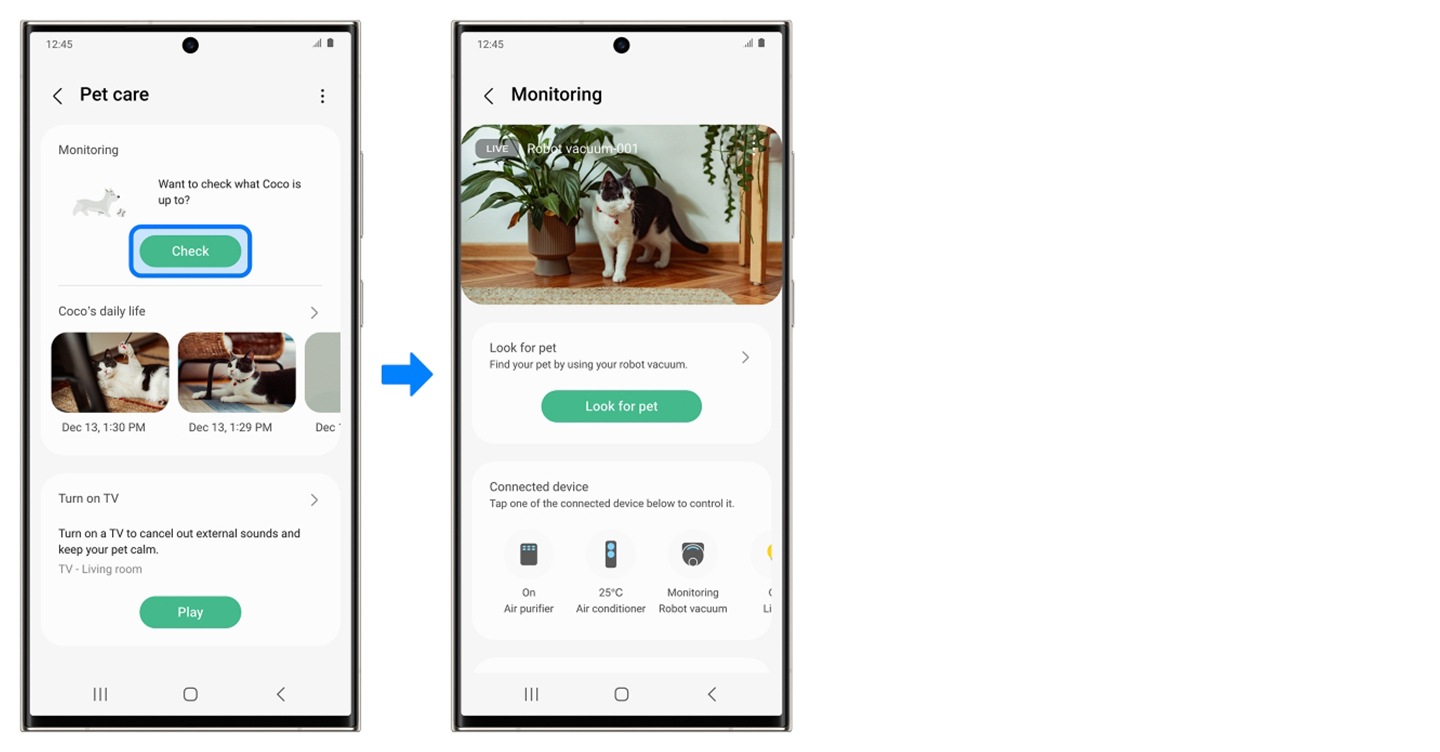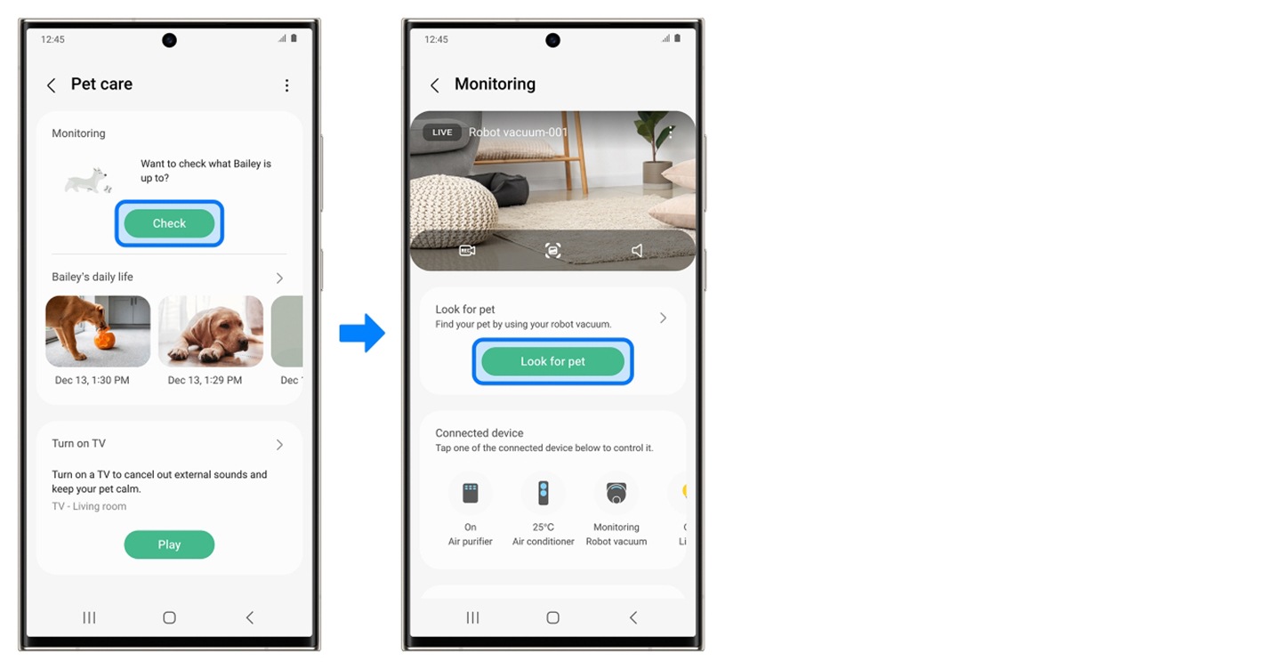 Үсэрхэг найздаа туслахад үргэлж бэлэн байгаарай. SmartThings Pet Care16 апп дээр та BESPOKE Jet Bot AI+ эсвэл гэрийн камераа17 ашиглан хайртай амьтнаа хэр байгааг шалгаж болно. Хэвийн биш байгааг анзаарвал та Home Alone Mode буюу "Гэртээ ганцаараа" горимыг идэвхжүүлэн тайвшруулаарай. Гадагш гарахдаа та гэрийн тэжээвэр амьтандаа Galaxy Smart Tag18 -ыг зүүж, байршлыг нь хянаснаар тайван байх боломжтой.