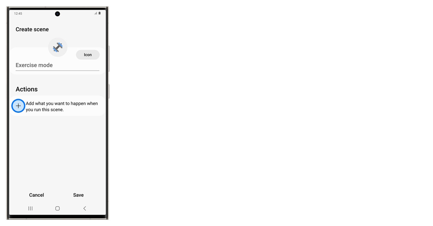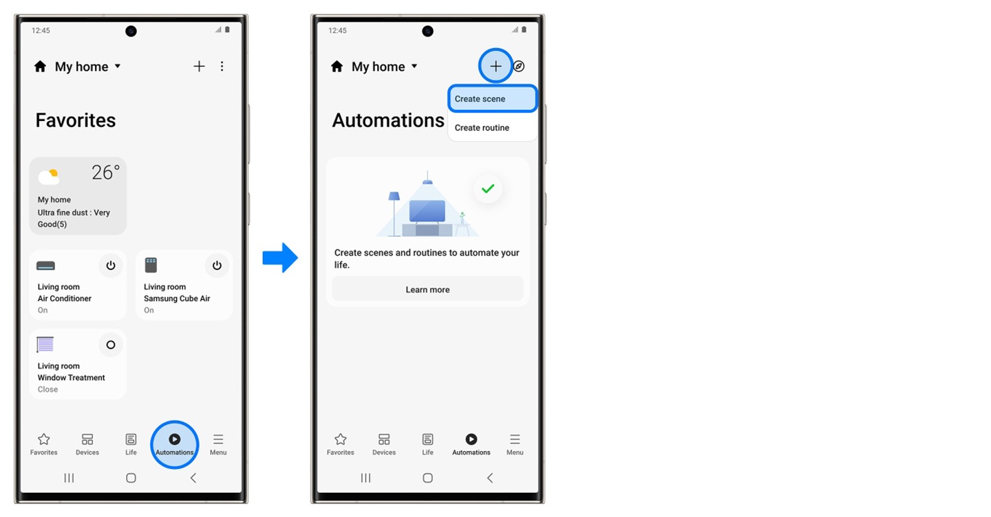SmartThings апп дээрээс доод хэсэгт байх 'Automations' цэсийг сонгон, баруун дээд өнцөгт гарч ирэх 'Create scene' товчлуур дээр дарна.
