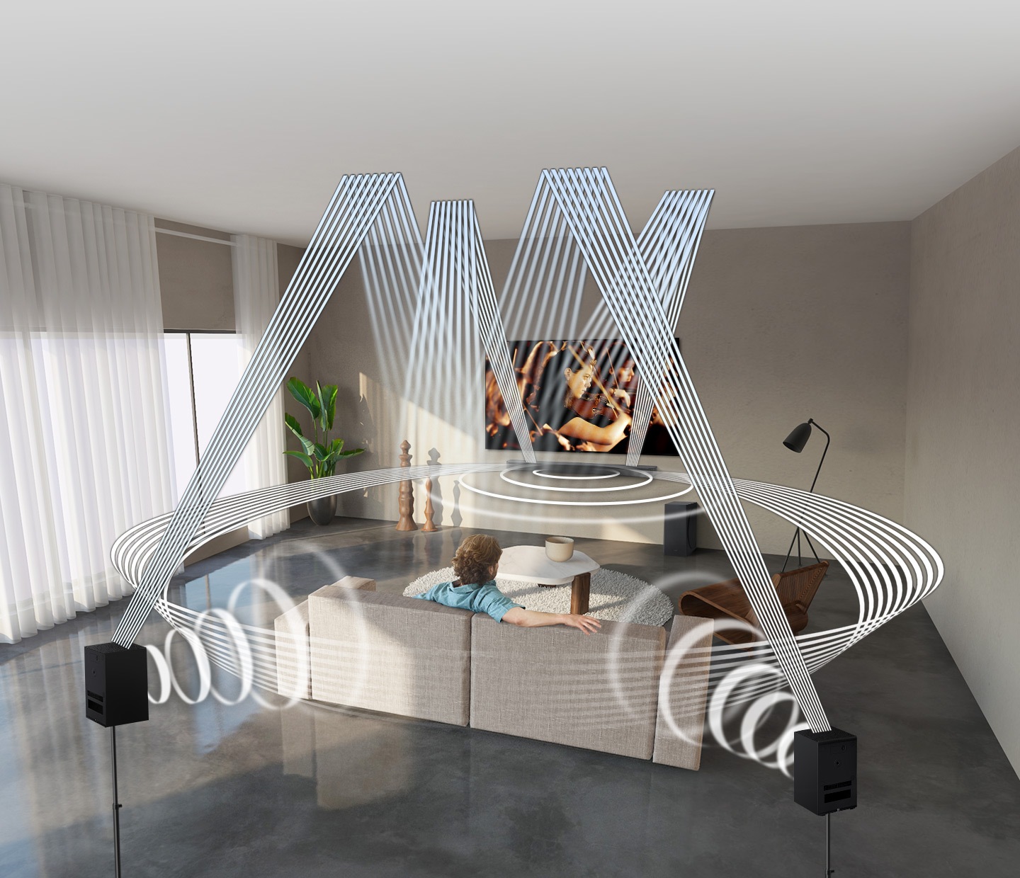 Explora las profundidades del sonido con Dolby Atmos y DTS: X. Los dos te permiten escuchar cada sonido distinto a medida que fluye a tu alrededor y por encima de ti, tal como lo harías en la vida real.