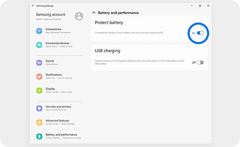 El modo de protección de la batería es una función de Galaxy que protege la batería de tu Galaxy Book limitando el nivel de carga máxima. Esto ayuda a proteger y mantener la vida útil de la batería cuando está conectada a un adaptador de CA durante períodos prolongados, como en una oficina.