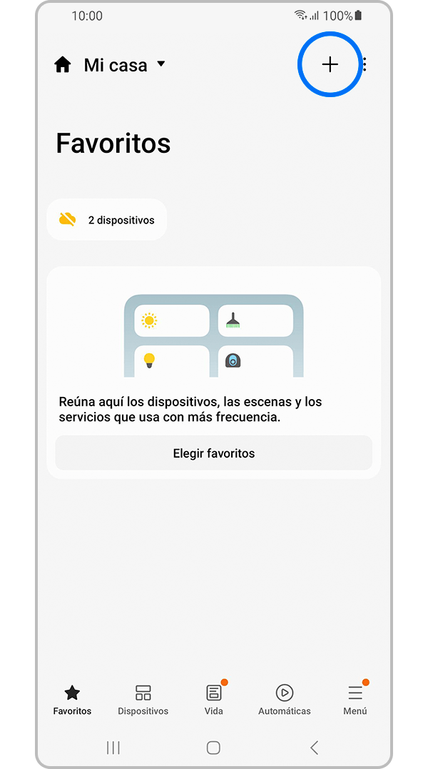 2. Inicia la aplicación SmartThings. Toca el botón más y selecciona [Añadir dispositivo] en la vista de inicio.