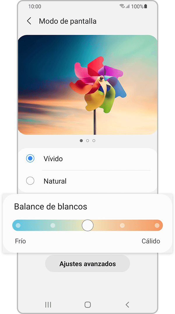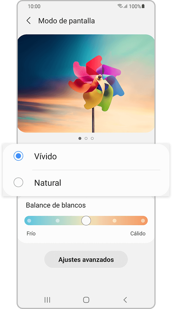 - Vivo: Esto optimiza la gama de colores, la saturación y la nitidez de tu pantalla. También puedes ajustar el balance de color de la pantalla por valor de color.