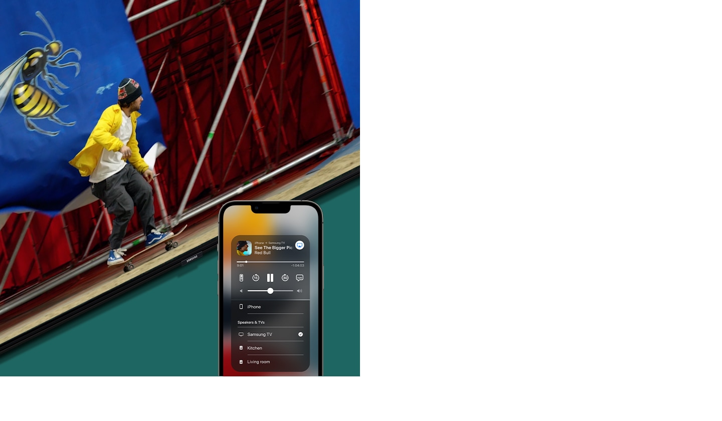 Ya sea que estés viendo contenido en la aplicación Apple TV o transmitiendo desde tus dispositivos Apple con AirPlay, todo funciona a la perfección con las Pantallas Samsung.