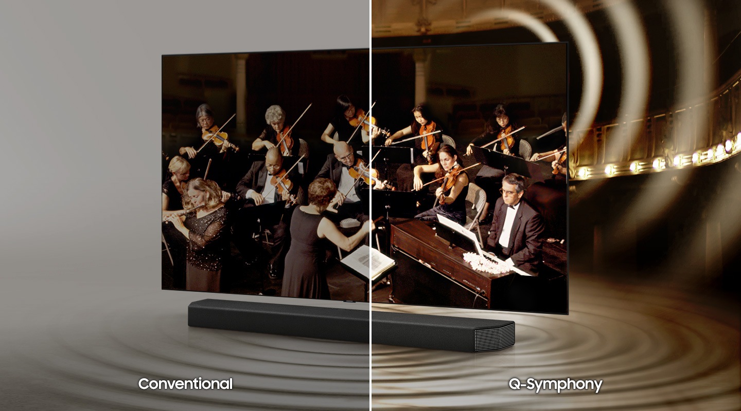 * Q-Symphony is compatible with 2021 Samsung TV (AU7000 ↑ TV and above).