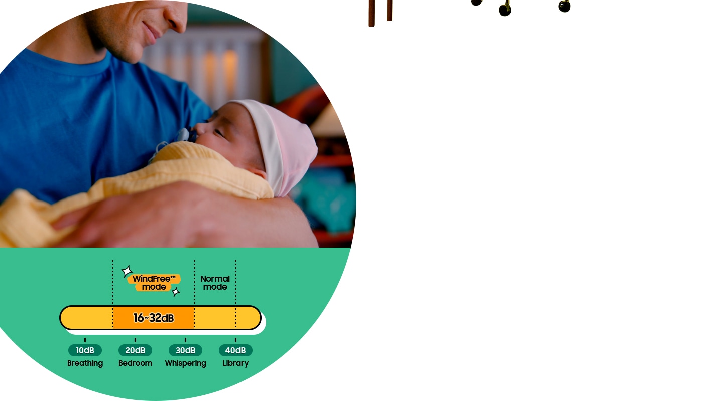 The low-speed WindFree™ Cooling features a quiet operation that minimizes ambient noise, so it generates significantly less detectable sound than the Normal cooling mode. Its low noise level is proven by rigid tests on each model in an anechoic room.⁶