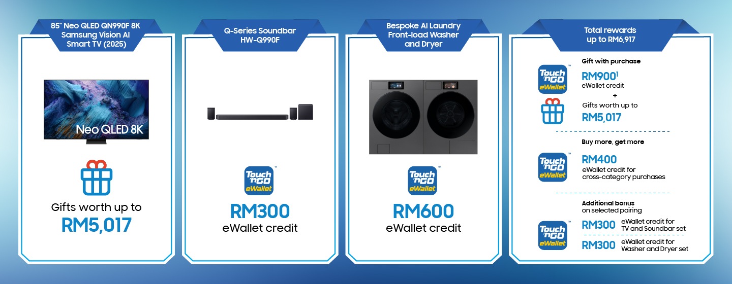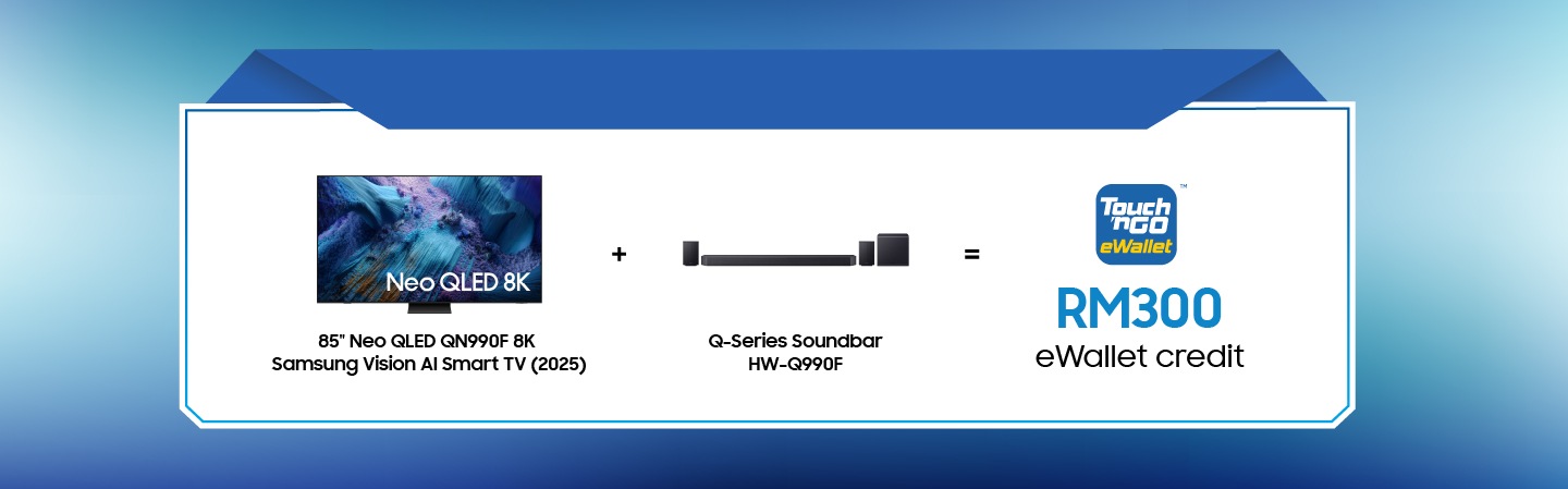 *For selected Samsung TVs, sound devices and home appliances only. Touch ‘n Go eWallet credit redeemable via Samsung Redemption Portal from 2 June – 15 August 2025. SmartThings availability may vary by country, region, service provider, network environment, or device and may change without notice. For full disclaimer, please visit https://www.samsung.com/my/smartthings.