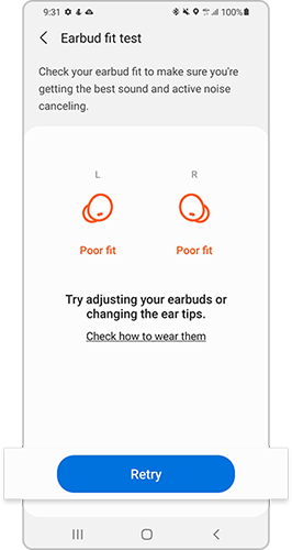 The Galaxy Earbud fit test is a feature that is provided for reference so that you can wear the Galaxy Buds2 correctly. If the results on the screen say you need to adjust your earbuds, try adjusting your earbuds or changing the ear tips, and tap Retry to start the test again.