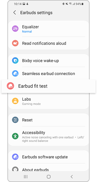 You can use the Galaxy Earbud fit test if you're not sure that you're getting the best possible sound quality and active noise cancelling. In the Galaxy Earbud fit test, while wearing the Galaxy Buds2, speakers in the earbuds emit a chime sound into the ear to detect and calculate bouncing sound that escapes through your earbuds for any sound loss. An ear tip showing the least sound loss would be recommended as best fit. Follow the steps below to test your ear buds.