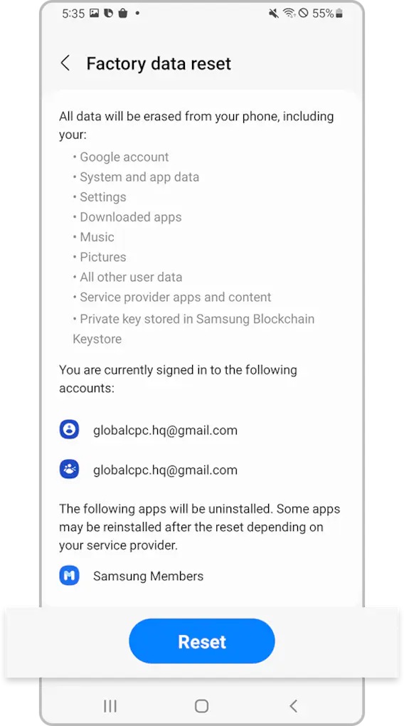 • Before performing a Factory data reset, make sure you have your device's data backed up. Data deleted during a Factory data reset cannot be restored.
