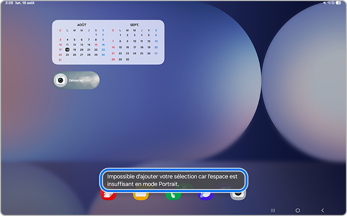 Lorsque vous essayez d'ajouter un widget à un espace vide en mode paysage mais que la disposition en mode portrait ne laisse pas suffisamment de place, l'arrière-plan devient rouge pour indiquer le problème et un message d'alerte s'affiche pour signaler que le widget ne peut pas être ajouté.