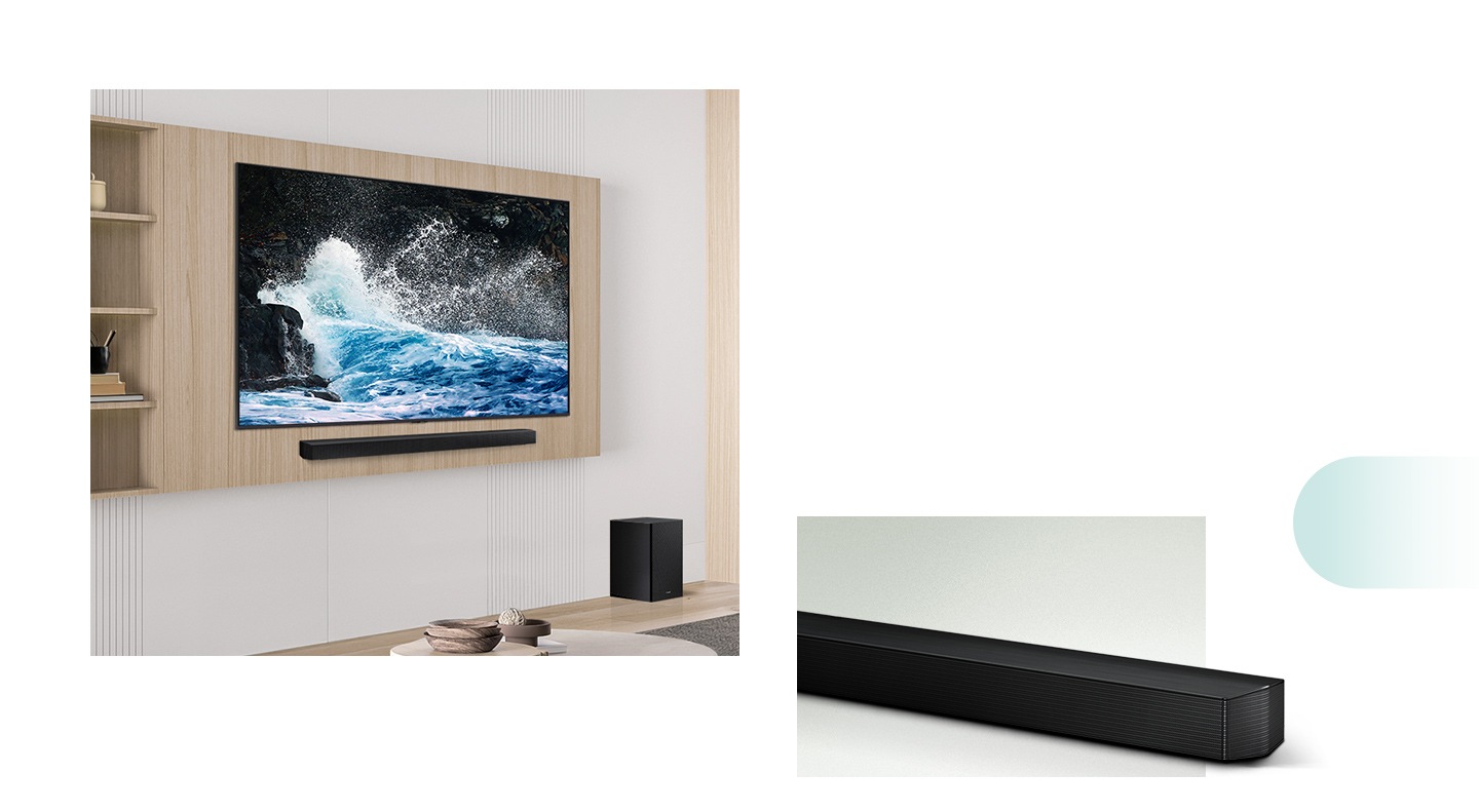 We zien onze beste Soundbar die een prachtig bioscoopgeluid levert. Laat je omringen door draadloos surroundgeluid van Dolby Atmos, alsof je in de bioscoop zit. Verbeter je ervaring door het soundbargeluid te synchroniseren met Samsung TV-speakers via Q-Symphony. En SpaceFit Sound Pro stemt het geluid automatisch af op de ruimte.