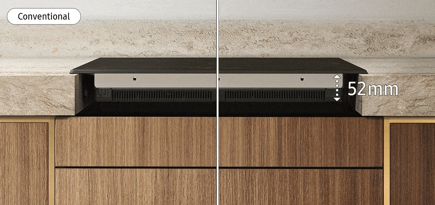 Voeg extra opbergruimte aan je keuken toe*. Het slanke ontwerp van de kookplaat combineert goed met verschillende werkbladen in verschillende diktes. Het betekent ook dat er meer ruimte is voor een grotere opberglade. En het slanke profiel vergemakkelijkt de installatie, zodat je tijd en kosten bespaart. 9