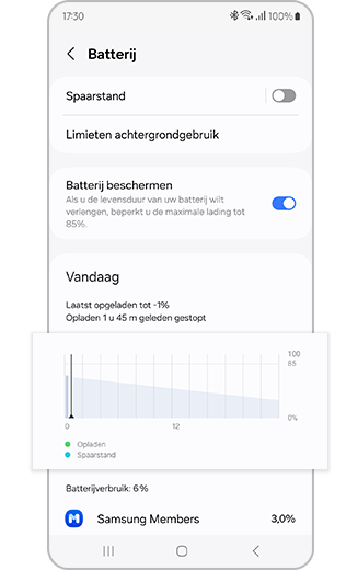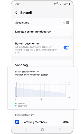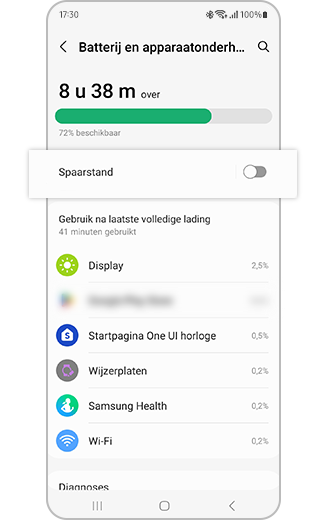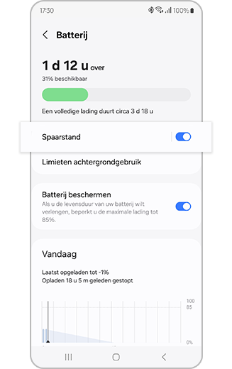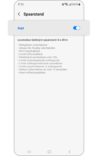 Wanneer 'Spaarstand' is ingeschakeld, zijn Wi-Fi en mobiele data beperkt en worden functies die veel batterij verbruiken zoals Always On Display uitgeschakeld om de batterijduur te verlengen.