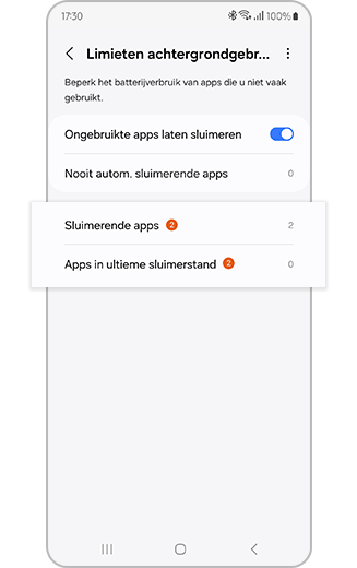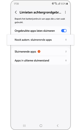 ※ Apps die zijn toegevoegd aan 'Nooit autom. sluimerende apps' gaan niet automatisch in (diepe) slaapstand en kunnen leiden tot extra batterijverbruik in de achtergrond.