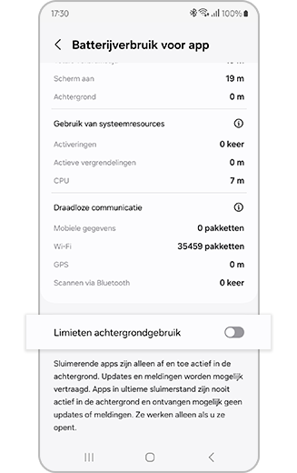 ※ Wanneer de 'Stroomspaarstand' is ingeschakeld, zullen er voor alle apps achtergronddatabeperkingen gelden en kunnen er ook beperkingen gelden voor locatiediensten.