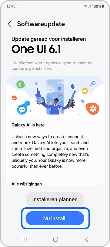 Om gebruik te kunnen maken van de Galaxy AI-functies, moet je ervoor zorgen dat de software van je toestel is bijgewerkt naar de nieuwste versie. Mogelijk ontvang je een pop-up op je telefoon waarin je wordt gevraagd de update te downloaden en te installeren of je kunt de software van je mobiele apparaat handmatig bijwerken door: