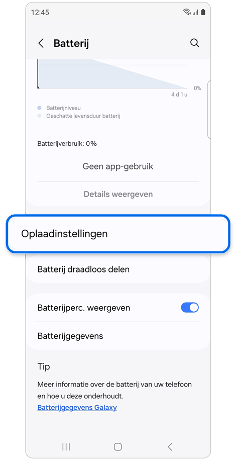 - Oplaadinformatie weergeven: Toon het batterijpercentage en de geschatte tijd tot volledige lading wanneer Always On Display is uitgeschakeld of niet wordt weergegeven.