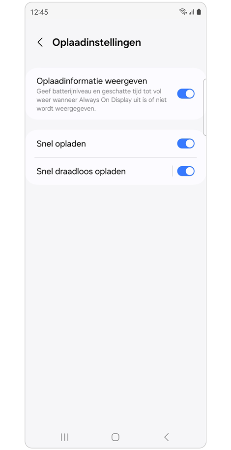 - Snel opladen: Schakel deze modus in wanneer je een adaptieve snelbedrade oplader gebruikt (15W of hoger).