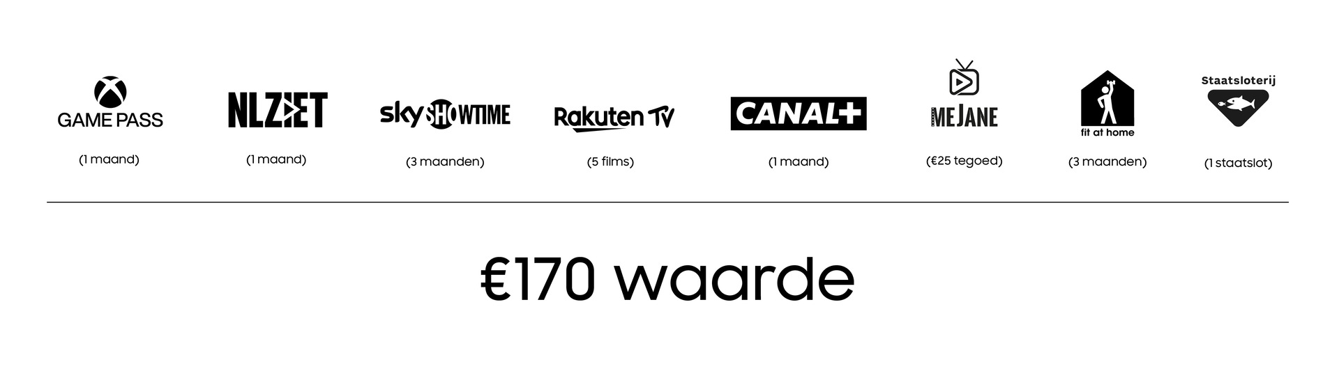 Bij aankoop van een Samsung TV ontvang je naast 5 jaar garantie ook een entertainment pakket ter waarde van meer dan €1701. Zo kun je je favoriete talkshow bekijken met NLZiet, een game avond organiseren via de Cloud Gaming app van Xbox of sportief aan de slag met de Fit At Home app! Alles is mogelijk dankzij het brede aanbod dat het Made for pakket biedt. Daarnaast ben je met 3 jaar aanvullende garantie (naast de standaard 2 jaar garantie) verzekerd van de optimale TV-ervaring!