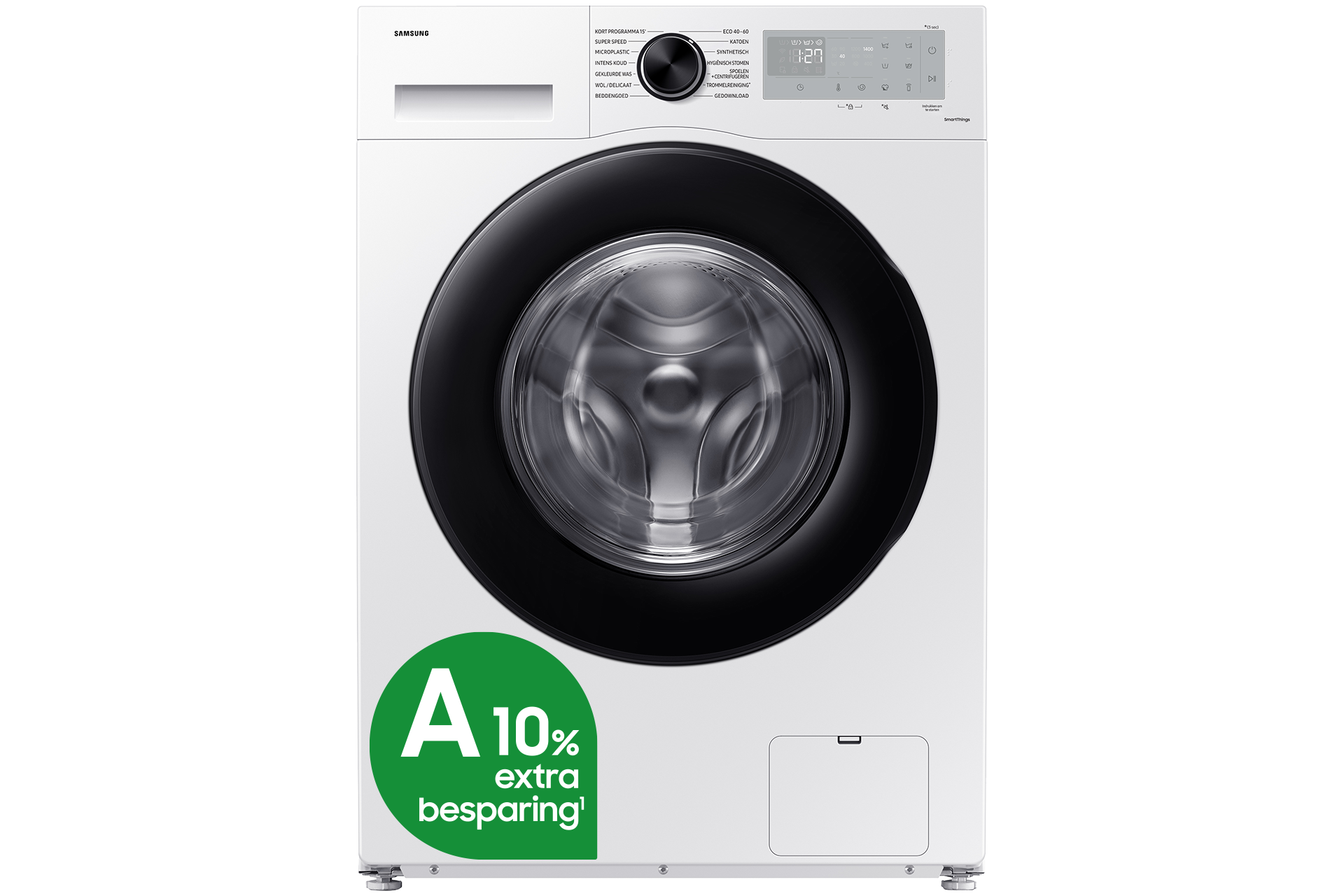 ³⁷ Het energieverbruik van WW90DB7* 7000-serie 9KG-model is 40 kWh, wat 10% energiezuiniger is vergeleken met de minimumdrempel van energie-efficiëntieklasse A (49,5 kWh voor 9KG-modellen). Het energieverbruik van WW11DB7* 7000-serie 11KG-model is 42 kWh, wat 10% energiezuiniger is vergeleken met de minimumdrempel van energie-efficiëntieklasse A (53,1 kWh voor 11KG-modellen). Energielabels zijn getest met het Eco 40-60 programma, 10% besparing getest met het Eco 40-60 programma.