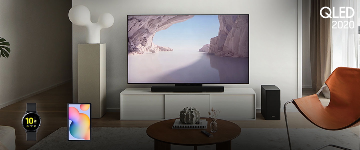 Samsung QLED 2020 TV gir deg en fantastisk brukeropplevelse. 100 % fargevolum, dypt sortnivå og kraftig lysstyrke – for et uslåelig bilde, uansett hva du ser på. Akkurat nå får du et eksklusivt Samsung-produkt med på kjøpet når du kjøper utvalgte QLED 2020 TV-er. Avhengig av hvilken modell du kjøper, får du enten en Galaxy Watch Active2 40 mm Black eller en Galaxy Tab S6 Lite Wifi 64 GB Grey på kjøpet.