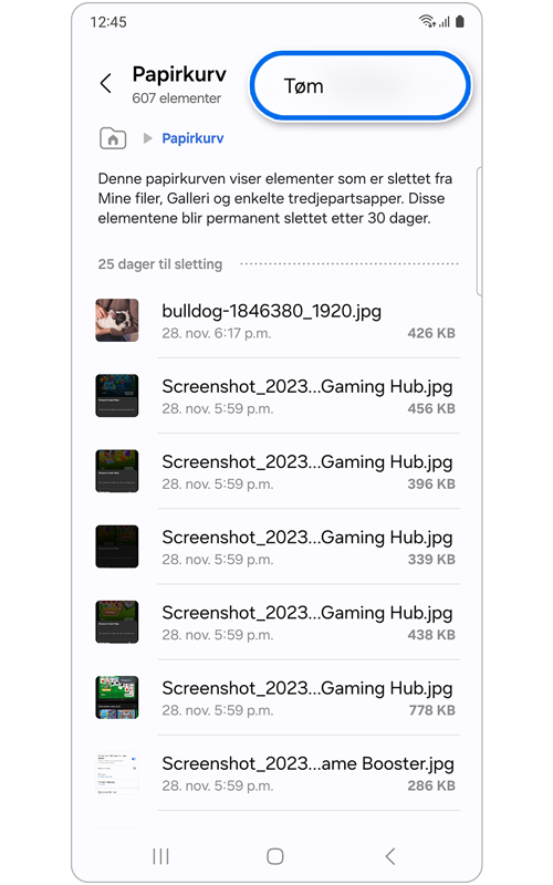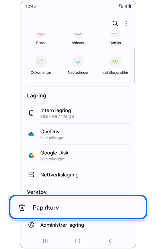 Merk: Du kan se slettede filer etter app (Mine filer, Galleri og Lydopptaker), samt gjenopprette eller slette dem fra Innstillinger > Enhetsvedlikehold > Administrer lagring > Papirkurv > Mine filer.