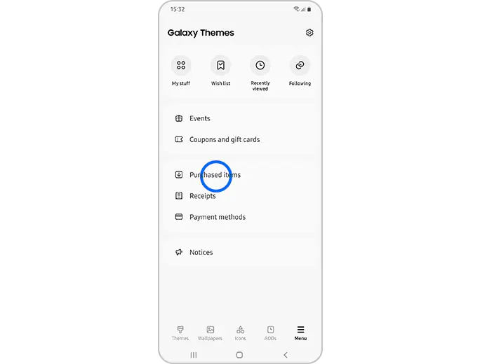 Temaer kjøpt (installert) fra en annen enhet kan lastes ned på nytt gratis og kan lastes ned fra opptil 10 enheter per kjøp ved å bruke den samme Samsung-kontoen i Galaxy Themes.