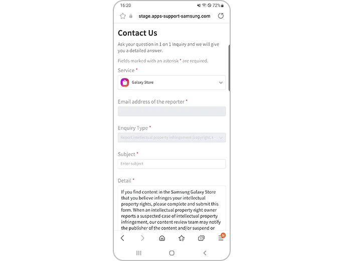 Når du ser etter en app eller annet innhold i Galaxy Themes og finner krenkelse av immaterielle rettigheter (for eksempel krenkelse av opphavsrett eller varemerke), så kontakt oss for å rapportere det.