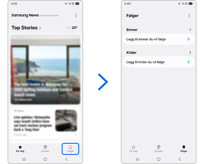 Følg bestemte emner og nyhetskilder for å motta mer personlig tilpasset innhold i feeden din.