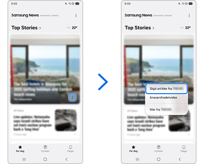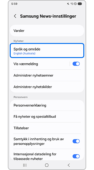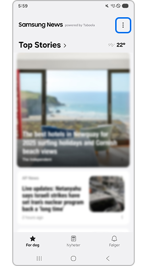 Merk: Samsung News er tilgjengelig på Galaxy-enheter med Android 9.0 (P OS) eller nyere og minst 4 GB RAM.