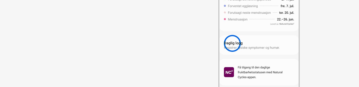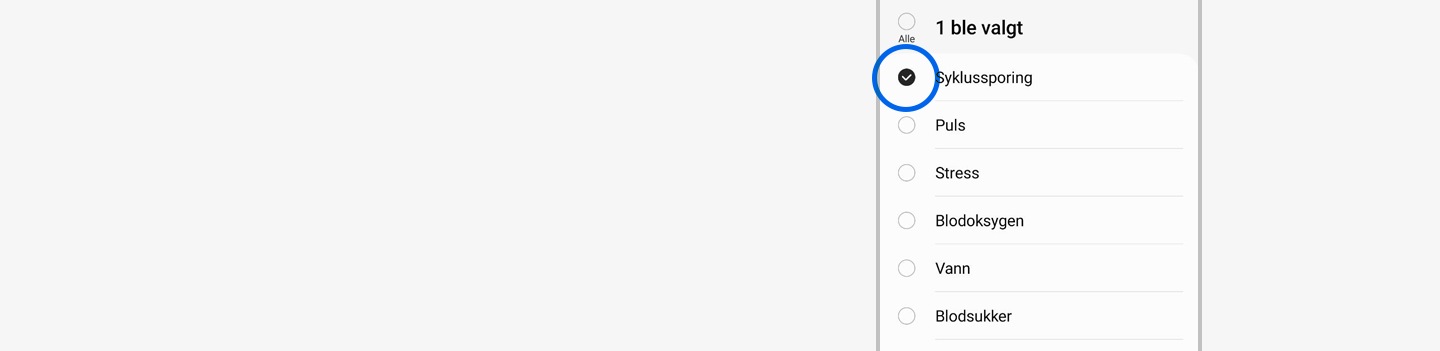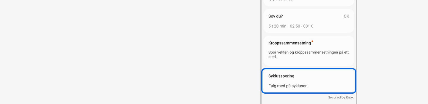 Ja, Syklussporing er kompatibel med Samsung Health-appen hvis den er installert på en enhet som kjører Android = (8.0) eller høyere.