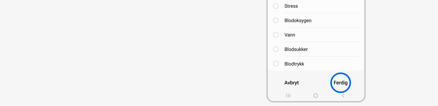 Ja, for å personliggjøre opplysningene som vises av appen, åpne Samsung Health og gå til Syklussporing > Flere alternativer > Innstillinger, og aktiver eller deaktiver deretter knappene under Info å vise