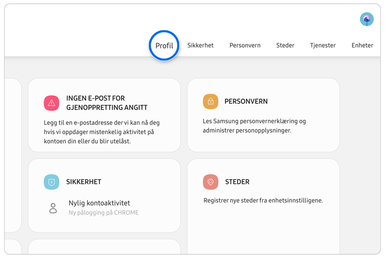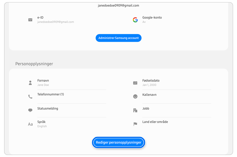 - Samsung-kontoer med et europeisk land som sitt valgte land eller region kan være begrenset mens de behandles for GDPR-rettigheter.