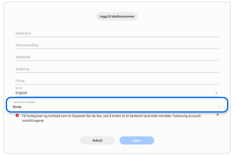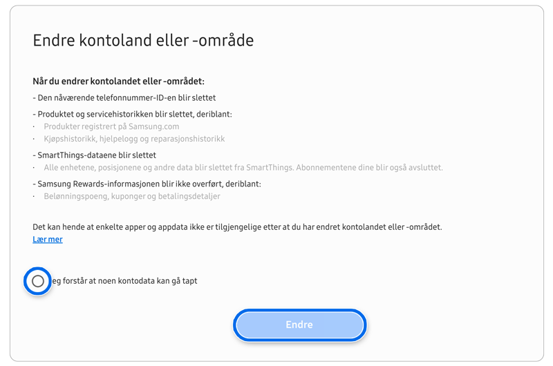Merk: En oppdatering vil være tilgjengelig i desember 2023, som vil tillate brukere å bruke en app på telefonen til å endre land eller område for sin Samsung-konto.
