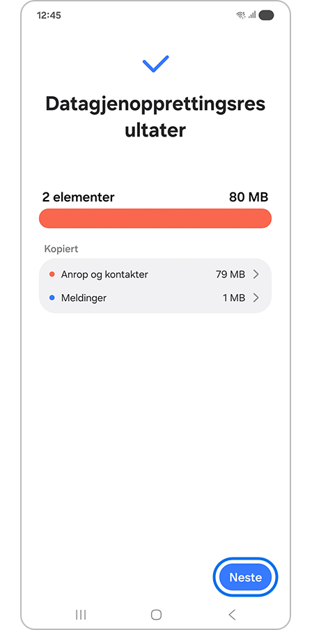 Trinn 7. Når overføringen er fullført på den gamle enheten, trykker du på Ferdig, og så sjekker du resultatet av overføringen på den nye enheten og trykker på Neste.