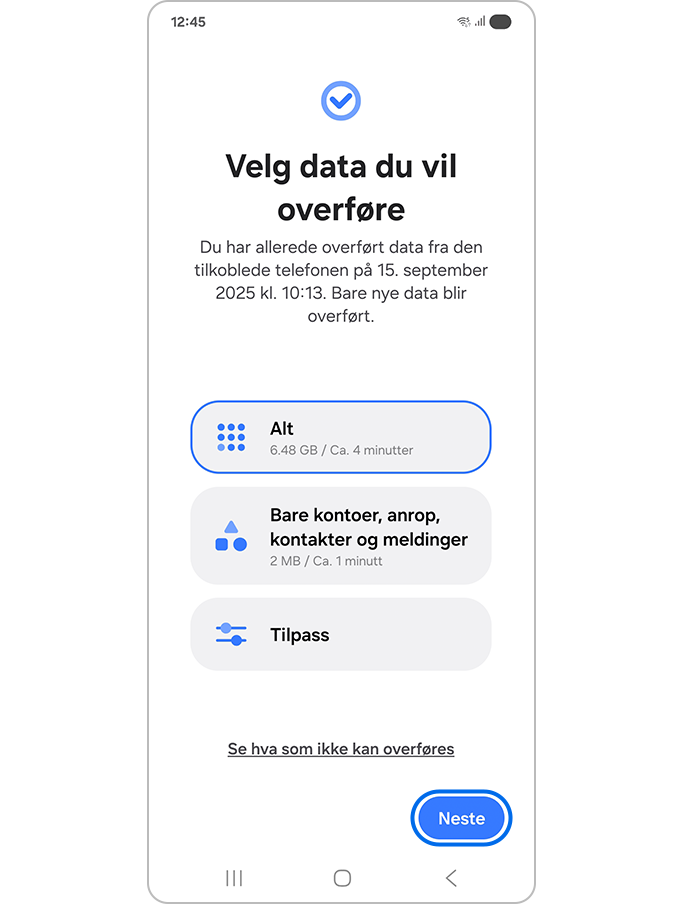 Trinn 6. Når den gamle enheten er koblet til, velger du dataene du vil overføre til den nye enheten, og deretter trykker du på Neste.