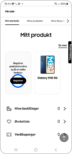 Alle Samsung-produkter kan registreres, unntatt minne- og lagringsenheter, tilbehør og produktkomponenter.
