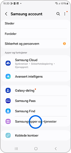 Hvis du vil finne og bruke Samsung-apper og -tjenester som er koblet til Samsung-kontoen din, gjør følgende: